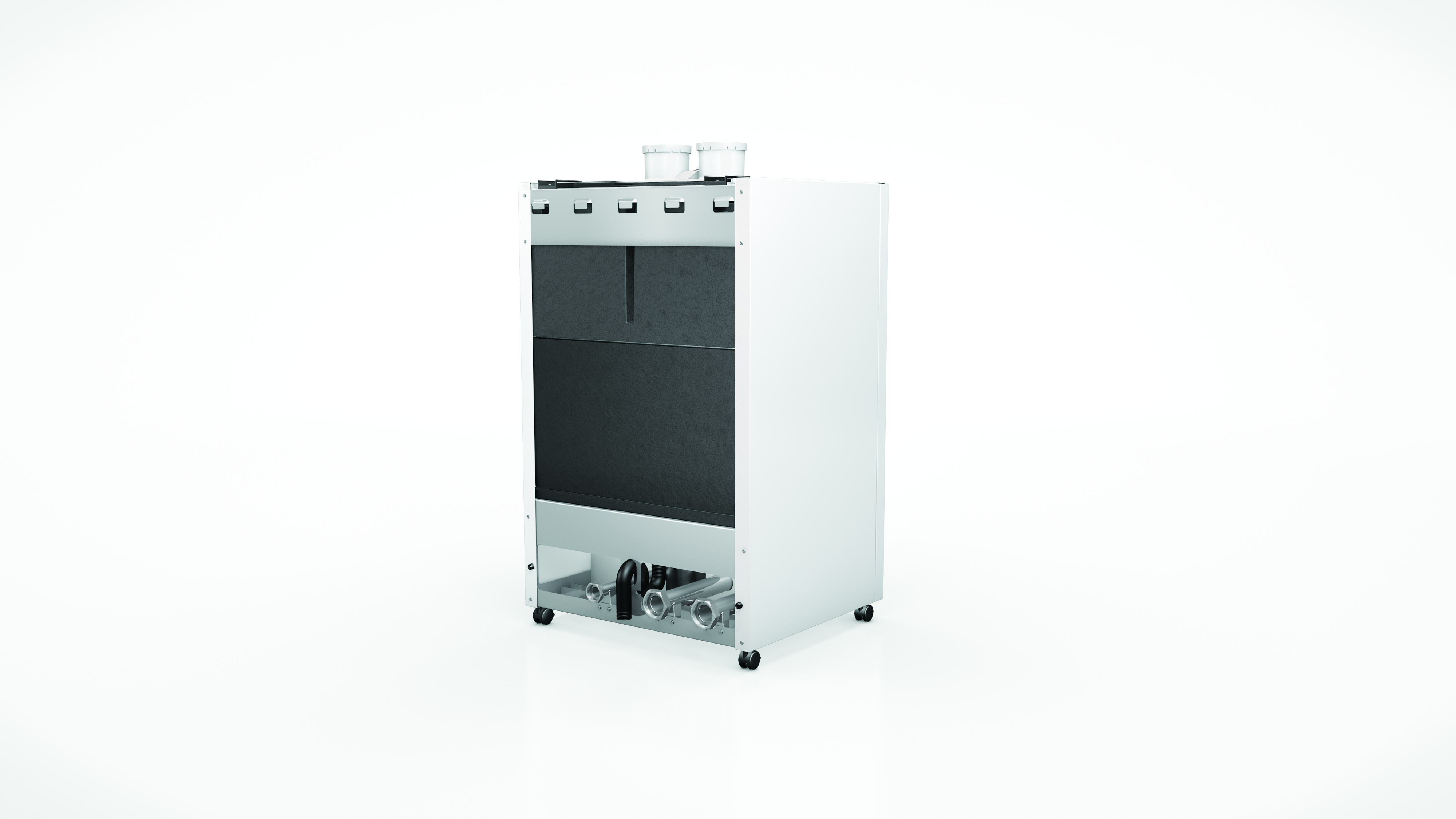- Amprentă la sol cu < 0,5 m² chiar și pentru cazanul de 200 kW